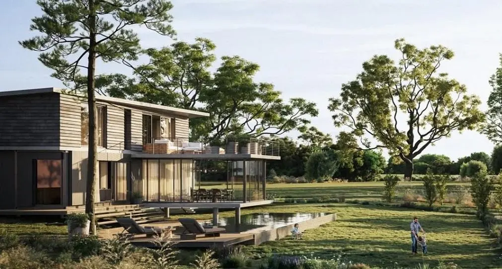 Bio‐senderos peatonales: interconectan barrios y espacios abiertos y sirven de límite natural forestado a las parcelas individuales, acentuando la autonomía y privacidad entre lotes.